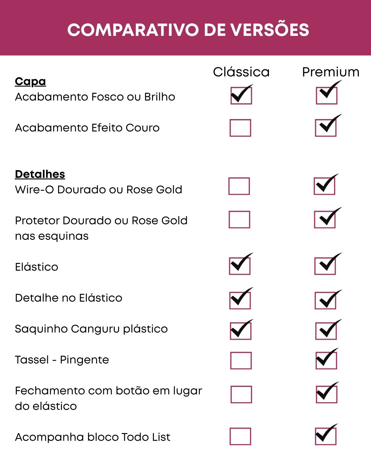 A nossa agenda é perfeita para quem busca praticidade no dia a dia sem abrir mão do estilo. No formato A5, é compacta e fácil de levar para qualquer lugar. Nas versões 1 dia por página e 2 dias por página oferece espaço de sobra para anotar compromissos, metas e reflexões, mantendo tudo organizado em um só lugar.